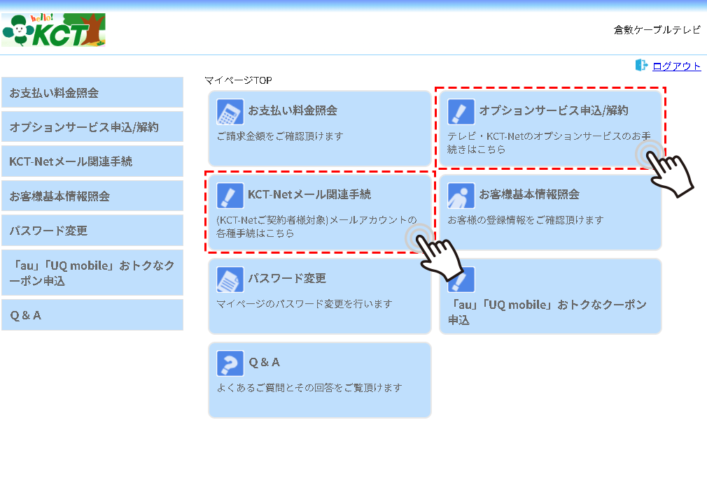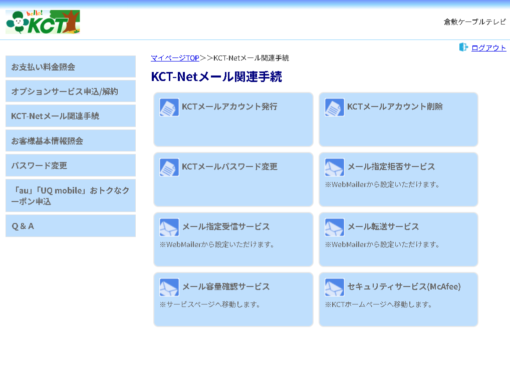 3.メールアドレスに関する手続きは「KCT-Netメール関連手続き」、それ以外のサービスについては「オプションサービス申込/解約」をクリックします。
