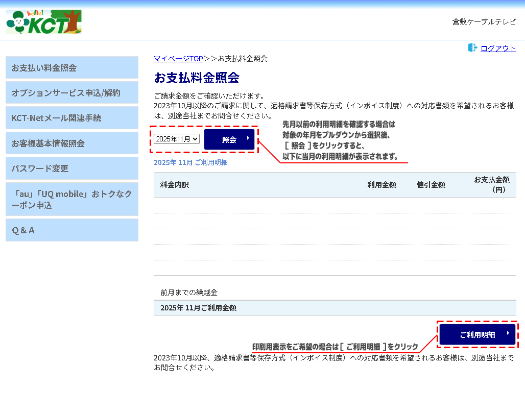 3.当月のご利用明細が表示されます。画面の内容に合わせて操作してご確認ください。
