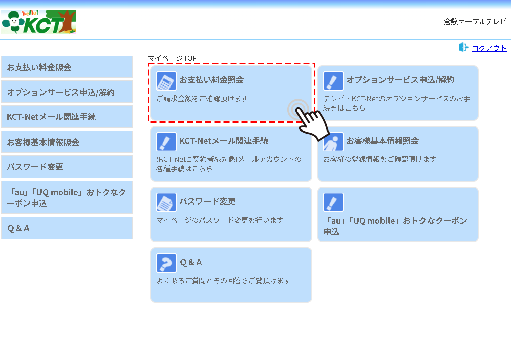 2.以下のページが表示されたら「お支払い料金照会」をクリックします。