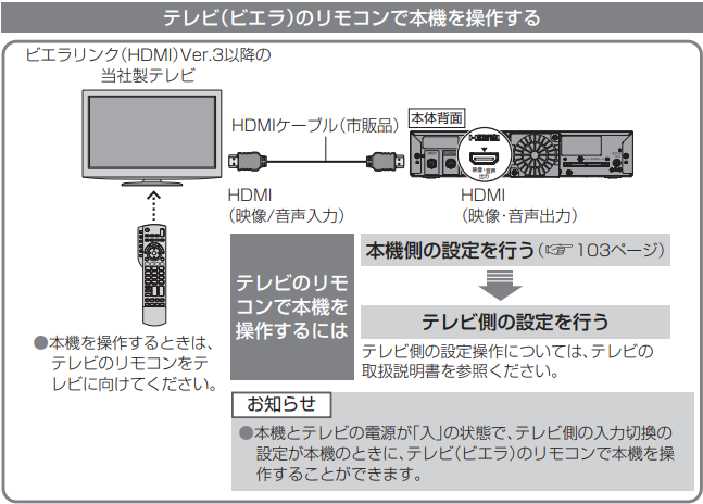 ※HDMI連動機能に対応したテレビが必要です。※テレビ側も連動設定を行う必要があります。テレビ側の設定方法については、テレビに付属する取扱説明書をご確認ください。