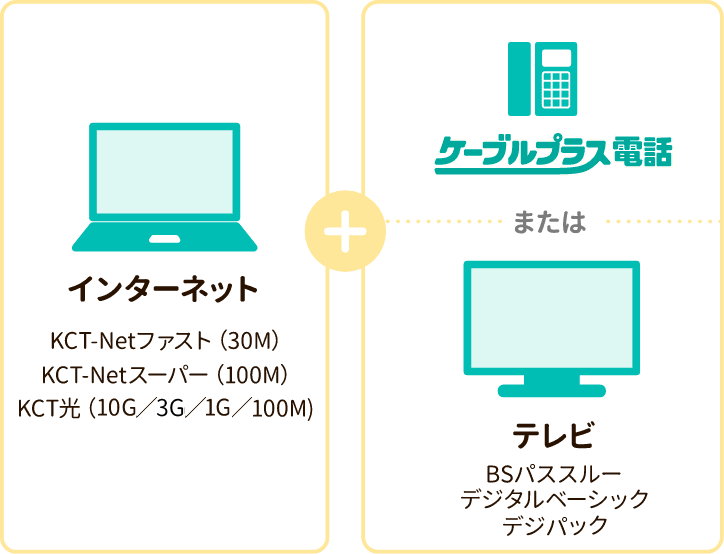 ★2:KCTサービス(「光インターネット」と「ケーブルプラス電話」または「光テレビ」)のご加入が必要です。加入例)光1G(最低利用期間2年)+光テレビ BSパススルーの場合、基本料金7,480円/月が別途必要です。最低利用期間内にご解約される場合、ご契約期間に応じて契約解除料が発生します。また、撤去工事費が別途かかります。